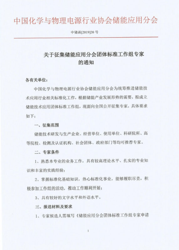中國(guó)化學(xué)與物理電源行業(yè)協(xié)會(huì)儲(chǔ)能應(yīng)用分會(huì)為統(tǒng)籌推進(jìn)儲(chǔ)能技術(shù)應(yīng)用行業(yè)相關(guān)標(biāo)準(zhǔn)化工作,根據(jù)儲(chǔ)能產(chǎn)業(yè)發(fā)展形勢(shì)的需要,擬成立儲(chǔ)能技術(shù)應(yīng)用團(tuán)體標(biāo)準(zhǔn)工作組,現(xiàn)面向全國(guó)公開征集專家,具體要求如下: