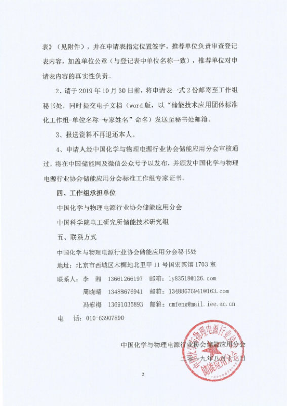 2、請(qǐng)于2019年10月30日前,將申請(qǐng)表一式2份郵寄至工作組秘書處,同時(shí)提交電子文檔(word版,以“儲(chǔ)能技術(shù)應(yīng)用團(tuán)體標(biāo)準(zhǔn)化工作組-單位名稱-專家姓名”命名)發(fā)送至秘書處郵箱。