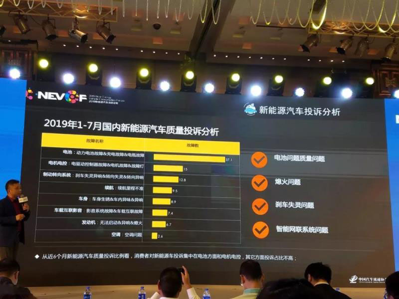 從投訴產(chǎn)品故障類型分,電池故障以及充電的故障占比達到了37.1%,電機電控電驅(qū)動相關(guān)的問題占了15%,轉(zhuǎn)向失靈、剎車失靈、轉(zhuǎn)向異響占了12.8%。另外續(xù)航不準(zhǔn)確達到了9.5%,車身有生銹達到了9.5%,車載智能平臺達到了7.4%,還有發(fā)動機(指電動機)是6.7%,空調(diào)等相關(guān)的問題是2.6%。