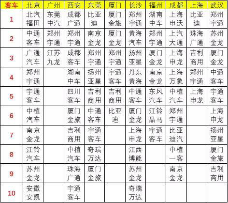 客車企業(yè)數(shù)量眾多,主力企業(yè)參與并非很強(qiáng),。吉利商用車表現(xiàn)突出,鄭州宇通、中通、北汽福田、比亞迪、東莞中汽宏遠(yuǎn)和南京金龍等表現(xiàn)較強(qiáng)等表現(xiàn)突出。