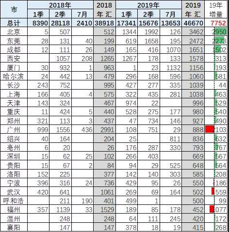 2019年7月的北京、西安、天津、東莞、鄭州等北方省會城市的的客車表現(xiàn)較好。部分城市19年1-7月銷量超越18年全年。