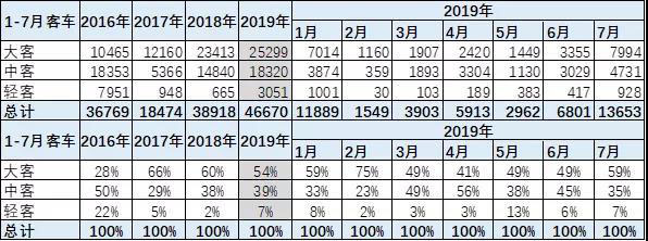 歷年1-7月客車占比僅有全年的20%左右,雖然18年上半年占比高,但19年占比18年全年銷量預(yù)計達(dá)到50%左右,目前看19年改善較大,市場潛力仍有待釋放。