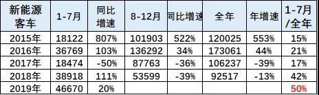 2019年新能源車增長總體很強(qiáng),其中乘用車增長突出,新能源客車19年1-7月4.66萬臺,同比增長20%,增長表現(xiàn)平穩(wěn),。19年1-7月客車的表現(xiàn)較強(qiáng)。