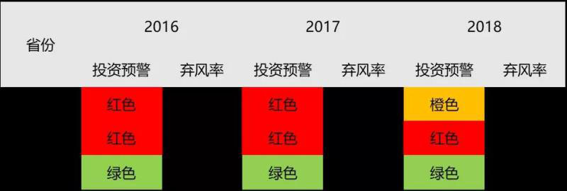 受內(nèi)部消納不足、外送通道缺乏及調(diào)峰空間有限制約,東北地區(qū)風(fēng)資源雖然豐富,但風(fēng)電發(fā)展緩慢,尤其是吉林省2016年棄風(fēng)率高達(dá)30%,2016~2018年連續(xù)三年受困投資紅色預(yù)警;黑龍江省2016年棄風(fēng)率達(dá)19%,2018年才由紅轉(zhuǎn)橙。