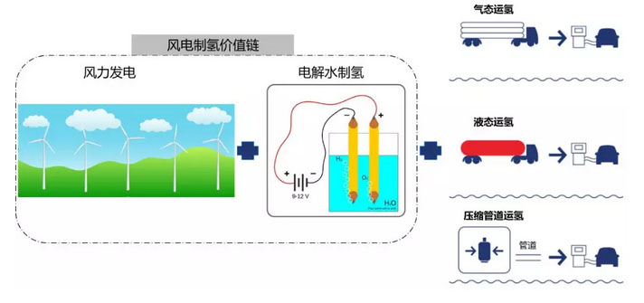 氫能也是唯一可同時(shí)應(yīng)用在交通、電力、工業(yè)等領(lǐng)域的清潔能源。對(duì)于風(fēng)電而言,可將自身綠色屬性通過氫能在交通運(yùn)輸、工業(yè)和建筑等終端應(yīng)用行業(yè)實(shí)現(xiàn)延伸。同時(shí),將棄風(fēng)所產(chǎn)生的損失,以轉(zhuǎn)化為氫能的方式進(jìn)行存儲(chǔ)、運(yùn)輸、應(yīng)用,能有效提高社會(huì)與自然資源利用率,進(jìn)一步實(shí)現(xiàn)“風(fēng)電-氫能-應(yīng)用行業(yè)”全產(chǎn)業(yè)鏈深度脫碳。