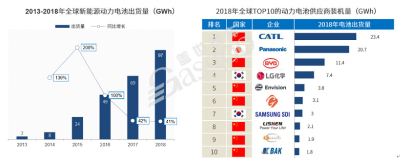 根據蓋世汽車研究院統(tǒng)計,2018年全球新能源動力電池出貨量達到97GWh,同比增長41%。而裝機量占據前十名的企業(yè)均被中日韓三國包攬,除來自日本的松下、來自韓國的LG化學、三星SDI以外,其余七家均為中國企業(yè),代表企業(yè)有寧德時代(CATL)、比亞迪和國軒高科。