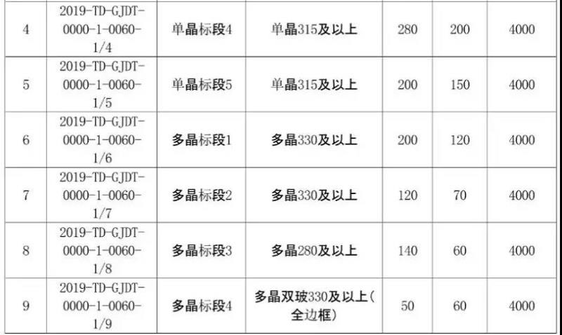 根據(jù)招標(biāo)公告,本次投標(biāo)人如對多晶標(biāo)段1、2、3進行投標(biāo),必須對這3個標(biāo)段全部進行投標(biāo),多晶標(biāo)段1、2所投組件應(yīng)為統(tǒng)一規(guī)格(功率);如對單晶標(biāo)段3、4、5進行投標(biāo),必須對這3個標(biāo)段全部進行投標(biāo),所投組件應(yīng)為統(tǒng)一規(guī)格(功率)。各標(biāo)段招標(biāo)規(guī)格及容量如下表: