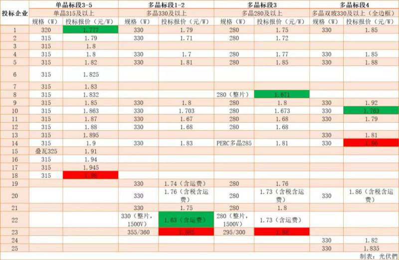 從開標(biāo)價格來看,此次投標(biāo)價格遠低于目前市場價(1.92-2.0元/瓦),最低報價1.777元/瓦,最高報價1.98元/瓦,平均報價1.862元/瓦。