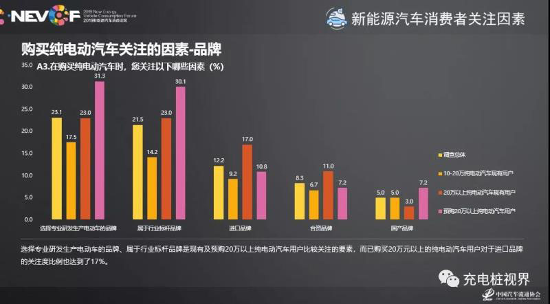 和燃油車(chē)一樣,品牌也是影響購(gòu)車(chē)決策的一大因素。消費(fèi)者普遍傾向于專(zhuān)業(yè)研發(fā)生產(chǎn)電動(dòng)車(chē)的品牌,屬于行業(yè)標(biāo)桿的品牌,認(rèn)為其品質(zhì)相對(duì)有保障。進(jìn)口品牌、合資品牌的認(rèn)可度還是高于自主品牌,特別是20萬(wàn)元以上純電動(dòng)車(chē)用戶(hù)更傾向于進(jìn)口品牌,他們比較看重技術(shù)先進(jìn)性、智能化程度以及細(xì)微處的駕乘品質(zhì)。造車(chē)新勢(shì)力的品牌形象普遍未真正樹(shù)立起來(lái),畢竟至今實(shí)現(xiàn)量產(chǎn)上市的不過(guò)八九家,品牌美譽(yù)度也還無(wú)從談起。