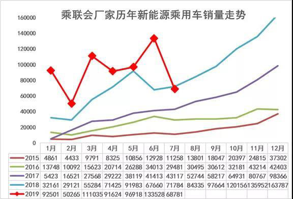 19年新能源車的開局良好,19年1月批發(fā)達到9萬臺,2月因多種因素回落到5萬臺,3月的退坡效應(yīng)達到11萬臺。4月的補貼新政實施期,廠家銷量達到9萬臺。5月新能源廣義乘用車批發(fā)達到9.7萬臺。6月13.4萬臺,同比增長6.2萬臺,表現(xiàn)很好。7月新能源車的銷量達到6.88萬臺,同比下降3%幅度是很好的。