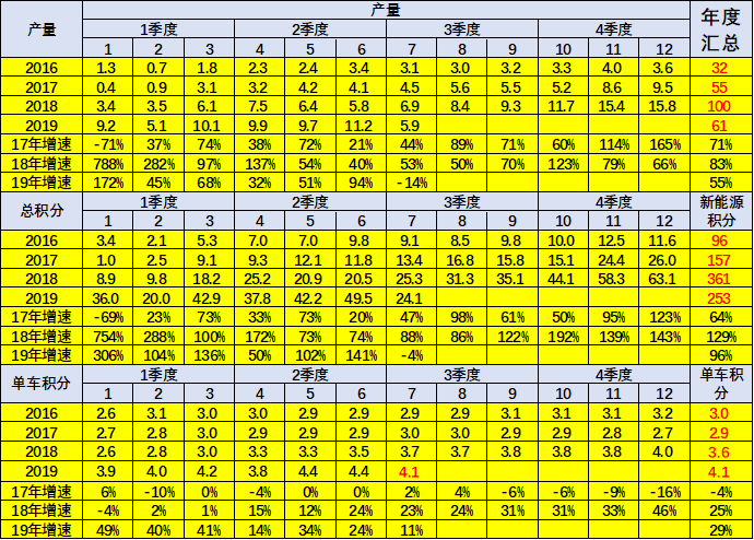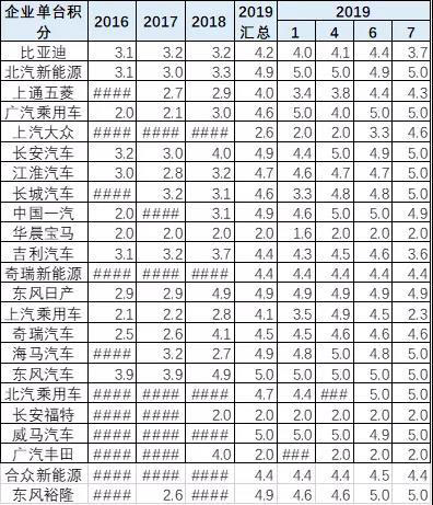 2019年各廠家的新能源車表現(xiàn)很好,總體積分提升很快,每家車企的積分基本也都是在提升中。比亞迪和北汽、吉利、北汽新能源、上汽乘用車、奇瑞的新能源車表現(xiàn)優(yōu)秀,總分和單車積分都有提升。