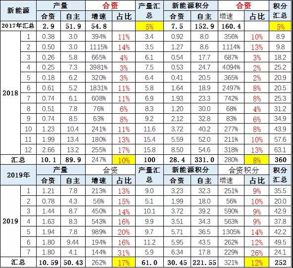 19年1-7月總體新能源車產(chǎn)量61萬臺,積分達到252萬分,1-7月合資產(chǎn)量同比增速達到近12%.。2019年合資企業(yè)新能源產(chǎn)品逐步到位,新能源產(chǎn)量積分增長迅猛,體現(xiàn)合資新能源的加速增長態(tài)勢。