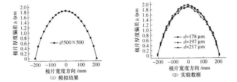 沿極片寬度方向,實(shí)驗(yàn)數(shù)據(jù)和模擬數(shù)據(jù)變化趨勢大體一致,沿極片寬度方向,邊部位置厚度偏差值較小,而在中部位置偏差值達(dá)到最大。如圖4。