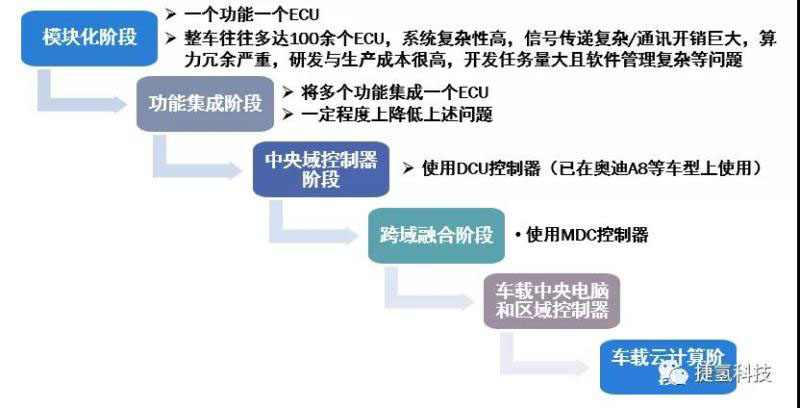 就像PC電腦,使用強大的CPU處理絕大多數(shù)運算是成本與體積最優(yōu)化的方案,域控制器的思路就是使用一個強大的多核芯片完成域內(nèi)絕大部分運算而取消眾多的其他控制器,這樣可以達到成本和體積的優(yōu)化,使得控制系統(tǒng)走向集成化,中心化(如下圖控制系統(tǒng)的演進路線所示)。使用域控制器對燃料電池系統(tǒng)內(nèi)的控制器進行集成設(shè)計,可以提高軟硬件集成度,減小模塊數(shù)量,降低質(zhì)量風(fēng)險,減小系統(tǒng)體積重量,增強生產(chǎn)線柔性,并有效降低成本,是未來重要的發(fā)展趨勢。