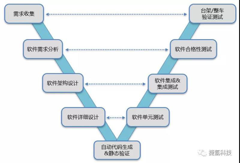 燃料電池軟件承擔(dān)如此之多的重要功能,其開發(fā)過程需要規(guī)范的開發(fā)流程與嚴格的測試流程。捷氫燃料電池系統(tǒng)的軟件開發(fā)采用基于模型開發(fā)(Model Based Design, MBD)的軟件開發(fā)方式,遵循V模式開發(fā)流程,同時使用ASPICE流程體系規(guī)定并約束軟件開發(fā)生命周期中的所有活動。軟件的開發(fā)過程包括需求收集與分析,到軟件架構(gòu)設(shè)計與詳細開發(fā),最終自動生成軟件代碼。而軟件開發(fā)的所有工作都對應(yīng)有多層次靜態(tài)驗證、動態(tài)測試或驗證的方法,以保證軟件的功能和質(zhì)量。