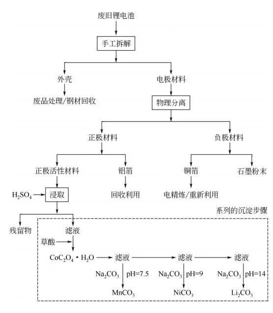 濕法冶金是先拆解電池外殼,破碎、篩分后獲取電極材料,電極材料中的有價(jià)金屬在酸或生物溶液中浸取,再進(jìn)行分離,獲得各金屬相應(yīng)的鹽或氧化物。