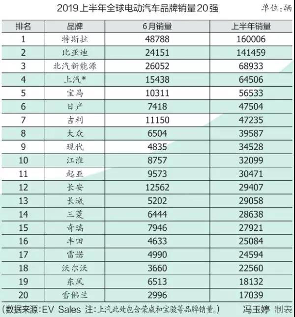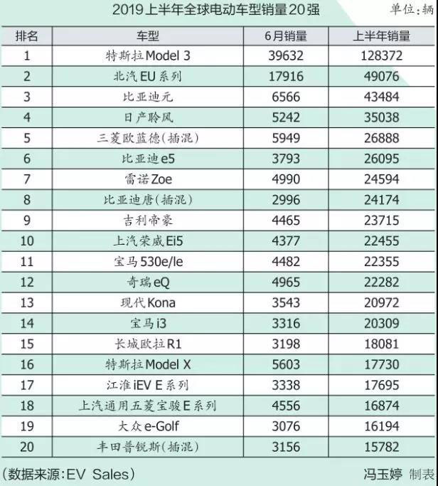 2018年,特斯拉Model 3以15.5萬輛的銷量成績成為全球最暢銷的電動車型。而在今年上半年,該車的銷量就已達(dá)到12.8萬輛,超過排行榜第2~4名車型銷量的總和,占據(jù)全球電動汽車市場11%的份額。的確,今年上半年,特斯拉Model 3在歐洲和美國的銷量一路猛漲,分別達(dá)到3.78萬輛和6.77萬輛。今年6月,特斯拉以3.96萬輛的銷量創(chuàng)造有史以來電動車型最高單月銷量紀(jì)錄。排在榜單第二和第三位的均為中國自主品牌旗下車型——北汽EU系列和比亞迪元,這兩款車上半年的銷量較為接近,分別為4.9萬輛和4.3萬輛。若單看6月銷量,北汽EU系列則遙遙領(lǐng)先,達(dá)1.79萬輛,同比增幅達(dá)到驚人的1113%,而去年排行榜的亞軍——北汽EC系列已悄然從榜單上消失。