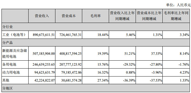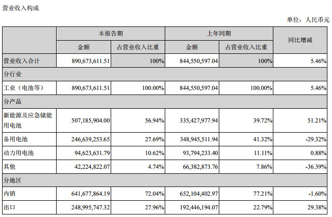 報告表示本期新能源及應(yīng)急儲能用電池營業(yè)收入同比增加51.21%,主要是由于海外應(yīng)急儲能業(yè)務(wù)銷售量增加所致。
