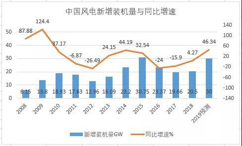按照當(dāng)時市場上幾家券商的普遍預(yù)測,在多重利好因素刺激下,2019年全國風(fēng)電新增裝機(jī)可能達(dá)到30GW左右,相比于2018年20.5GW裝機(jī),增速將超過46%,而這一增速將創(chuàng)2010年以來新高。
