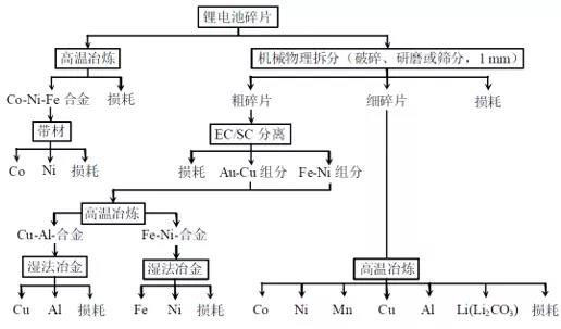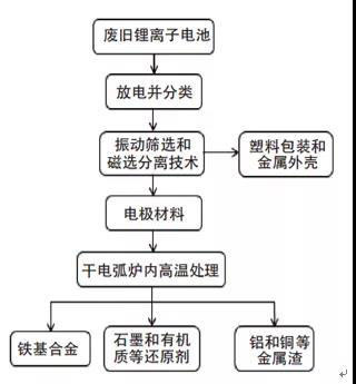 日本的索尼/住友公司對(duì)廢舊鋰離子電池的火法冶金處理進(jìn)行了系統(tǒng)研究,結(jié)果表明,在低于1000℃下對(duì)未處理、未拆解的廢舊鋰電池直接進(jìn)行焚燒,電池可以實(shí)現(xiàn)自我解離,焚燒后的殘余物中有鐵、銅、鋁等金屬,再通過篩分、磁選等方法使有價(jià)金屬分離開來,回收再利用,金屬元素回收率較高,但是金屬單質(zhì)回收率有待提高。
