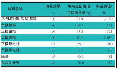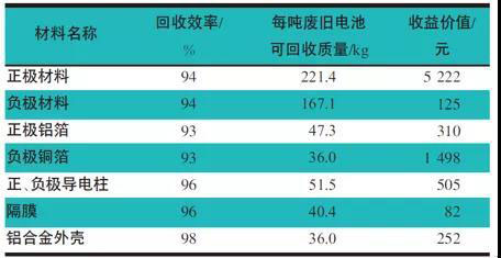 動(dòng)力電池內(nèi)富含的大量有價(jià)金屬是電池回收主要的收益來源,特別是近年來鎳、鈷、錳、鋰等金屬材料價(jià)格的上漲對(duì)動(dòng)力電池拆解回收領(lǐng)域起到了巨大的促進(jìn)作用。表2示出每噸三元材料廢舊動(dòng)力電池采用物理方法拆解的回收效率及得到各材料主要收益情況。