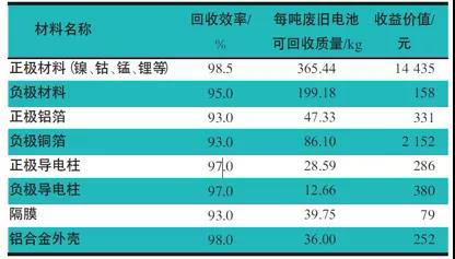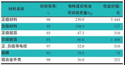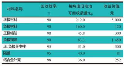 表3 磷酸鐵鋰電池拆解回收效率及收益