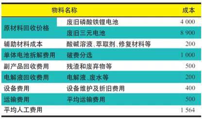 通過調(diào)研,發(fā)現(xiàn)濕法回收工藝的成本主要來源于原材料回收成本、廢水廢棄物處理等方面,表4 示出每噸廢舊電池處理過程中的主要成本去向。