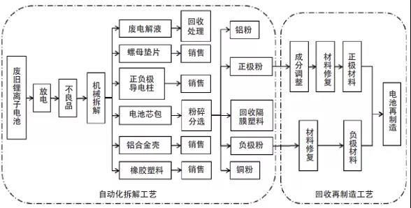 廢舊動(dòng)力鋰電池的化學(xué)和物理回收工藝都有各自的優(yōu)缺點(diǎn),回收對(duì)象也不盡相同。因此,如果通過優(yōu)化,采用聯(lián)合回收工藝的方法,可以發(fā)揮各種基本工藝的優(yōu)點(diǎn),盡可能回收可再生資源和能量,提高回收的經(jīng)濟(jì)效益。