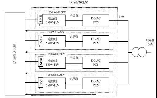 為蓄電池電網(wǎng)調(diào)峰系統(tǒng),該系統(tǒng)通常由監(jiān)控保護(hù)系統(tǒng)、單體二次電池組成的電池組模塊、電池管理系統(tǒng)(BMS)、雙向儲(chǔ)能變流器等幾部分構(gòu)成。