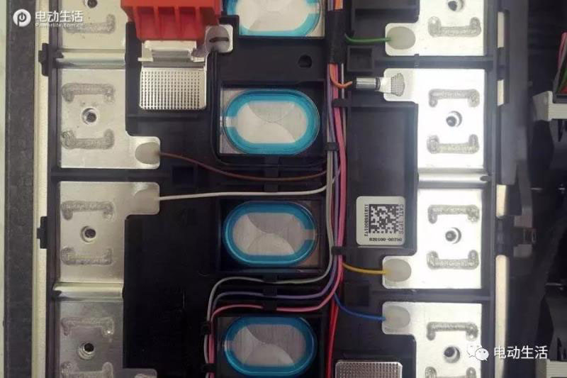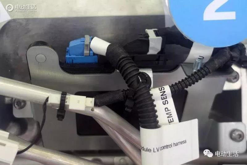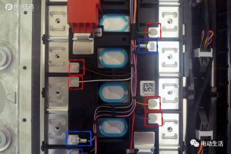 照片中紅色框體內(nèi)的,是檢測電壓數(shù)據(jù)的數(shù)據(jù)線,而籃框部分的則是檢測溫度的傳感器數(shù)據(jù)線,而那個(gè)被壓成小扁片樣子的接頭,其實(shí)是一個(gè)小的溫度傳感器。所以大家可以看到,紅色的電壓監(jiān)控?cái)?shù)據(jù)每個(gè)電池模組上都有;而藍(lán)色框的溫度檢測數(shù)據(jù)線,每隔一個(gè)電芯模組才有一個(gè)。