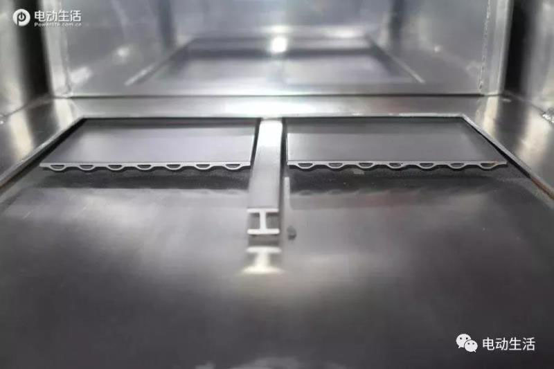 由于這個(gè)電池包帶有液冷系統(tǒng),因此冷卻液通過下箱體與電芯之間,帶有液體流通管道的冷卻液導(dǎo)板。由于樣品被遮擋,我們用I-PACE的電池箱體做示意,原理基本一樣。