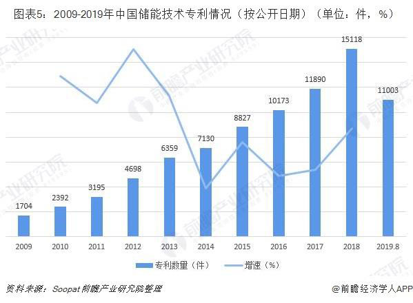 以“儲能”為關(guān)鍵詞在“SooPAT專利信息搜索引擎進行檢索,2009-2018年,中國儲能技術(shù)專利量呈快速上升的趨勢,其年復合增長率達36.59%。2019年1-8月,中國儲能技術(shù)專利數(shù)量新增11003件,整體來看,我國儲能電站產(chǎn)業(yè)技術(shù)活躍度較高。