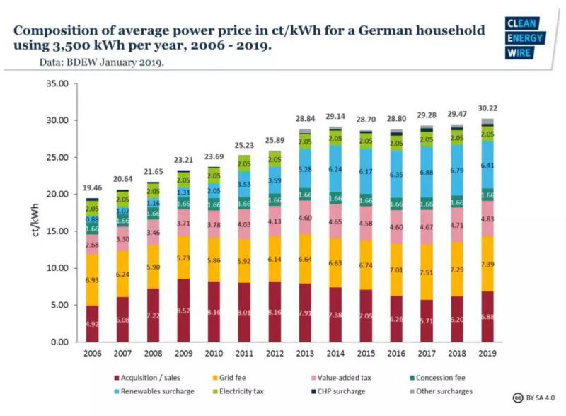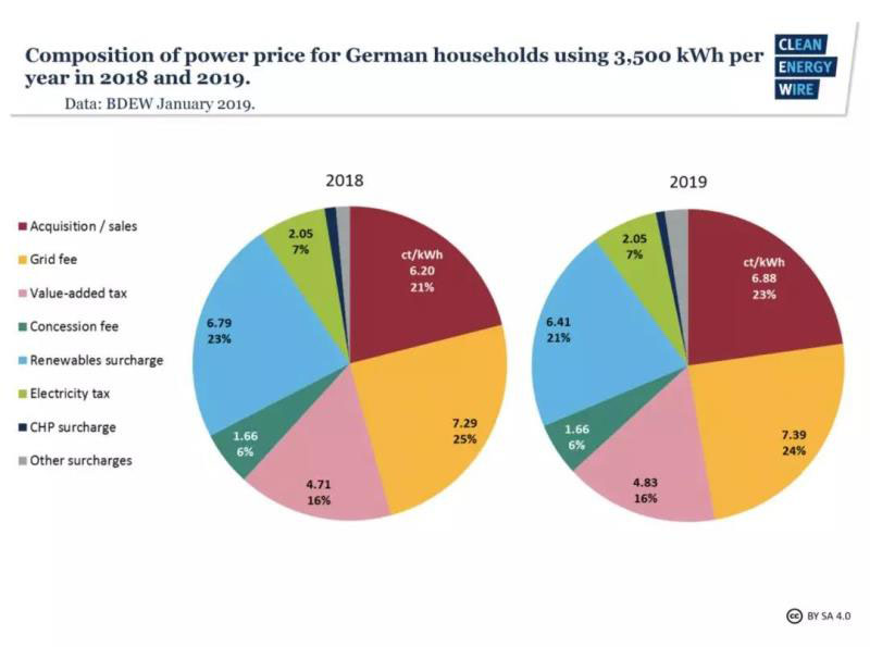 2019年德國居民電價30.22歐分/千瓦時(約合人民幣2.37元/千瓦時),其中包含可再生能源附加費(6.41歐分/千瓦時,約合人民幣0.5元/千瓦時),占到居民電價的21%。