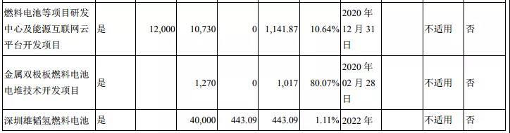 公司還在半年報中透露了募集資金總體使用情況,目前雄韜股份募集資金總額達13.2億元,已累計投入募集資金總額4.44億元,其中有三個項目涉及燃料電池。