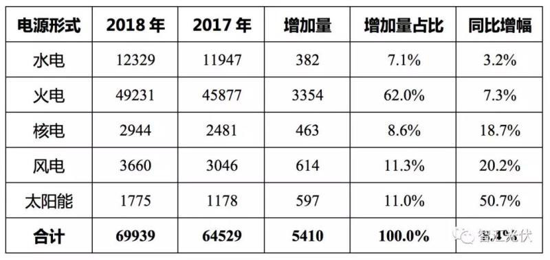 中電聯(lián)官網(wǎng)公布的《2018年全國電力工業(yè)統(tǒng)計快報一覽表》,2018年和2017年的發(fā)電量情況如下表所示。