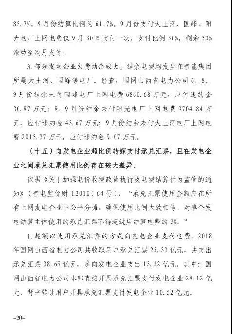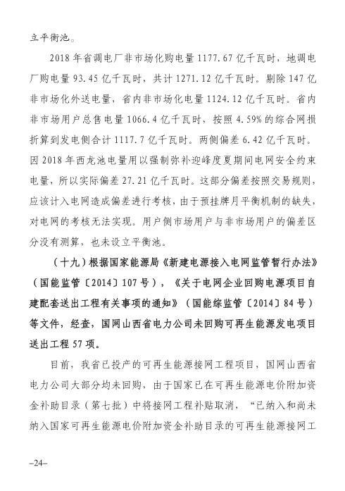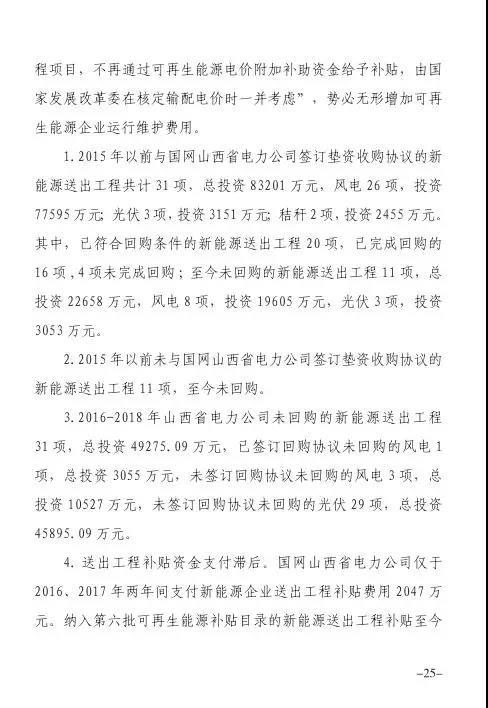 同時,據(jù)國家能源局《新建電源接入電網(wǎng)監(jiān)管暫行辦法》(國能監(jiān)管<2014>107號),《關(guān)于電網(wǎng)企業(yè)回購電源項目自建配套送出工程有關(guān)事項的通知》(國能監(jiān)管<2014>84號)等文件,經(jīng)查,國網(wǎng)山西省電力公司未回購可再生能源發(fā)電項目送出工程57項。其中,至今未簽訂回購協(xié)議未回購的風電工程12項,總投資3.32億元,光伏工程32項,總投資4.89億元。