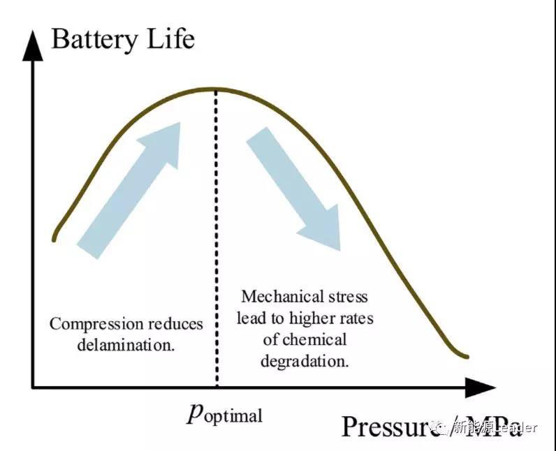 在單體電池組合時(shí)為了穩(wěn)定電池組的結(jié)構(gòu),通常需要施加一定的壓力,而壓力大小對(duì)于鋰離子電池的循環(huán)壽命有著一定的影響,研究表明施加一定程度的壓力有利于提升電極之間的接觸,從而改善電池的使用壽命,但是當(dāng)壓力過(guò)高時(shí)由于電池內(nèi)阻增加,引起負(fù)極極化的增加,從而導(dǎo)致負(fù)極析鋰等問(wèn)題,使得鋰離子電池壽命在較大壓力下急劇衰降,因此選擇合適的壓力對(duì)于鋰離子電池的壽命提升同樣重要。