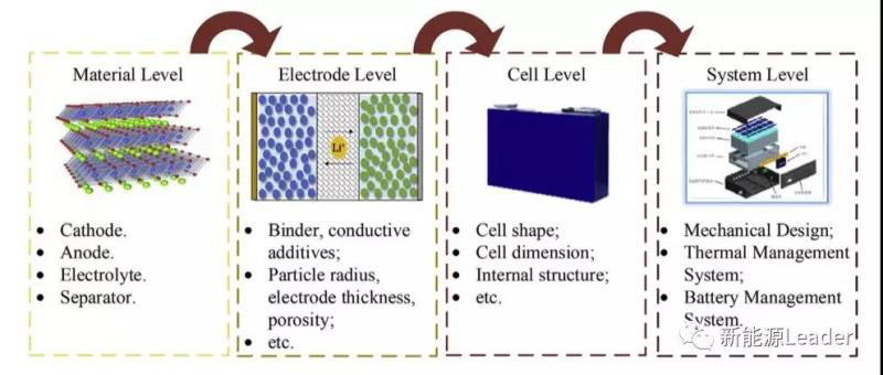 電池設(shè)計(jì)自下而上分為材料級(jí)、電極級(jí)、電池級(jí)和系統(tǒng)級(jí)四個(gè)層次,每個(gè)層次的設(shè)計(jì)都會(huì)對(duì)鋰離子電池的使用壽命產(chǎn)生顯著的影響。