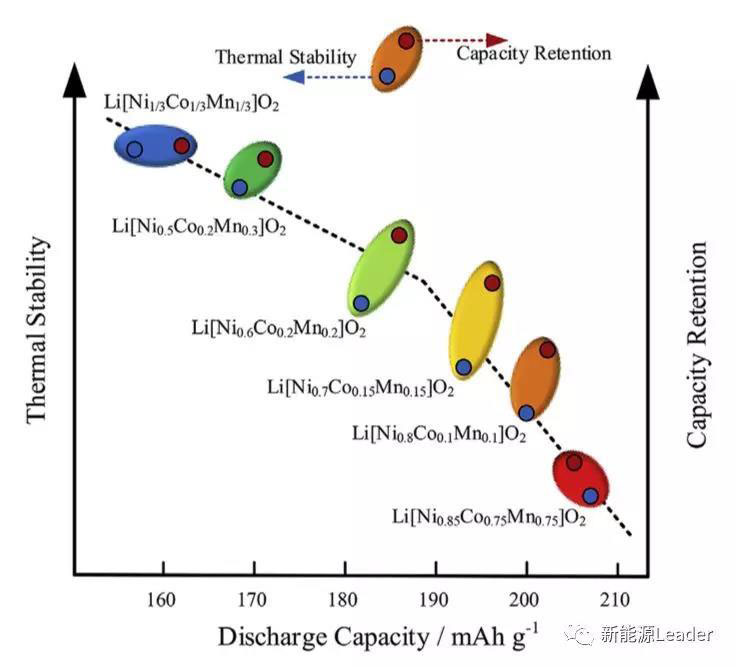 隨著Ni含量的提高,高鎳NCM材料的熱穩(wěn)定性和循環(huán)穩(wěn)定性都會(huì)發(fā)生進(jìn)一步的降低,特別是因?yàn)镹i2+與Li+之間半徑接近,這會(huì)導(dǎo)致較為嚴(yán)重的Li/Ni混排現(xiàn)象,影響鋰離子電池性能和循環(huán)壽命,也加劇了高Ni三元材料的表面相變,使得材料的界面阻抗增加,影響電池的功率性能。