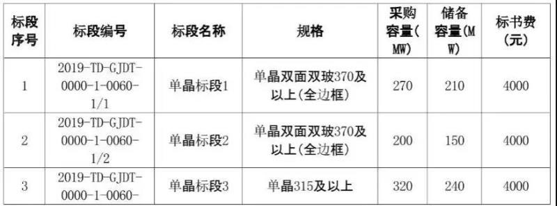 根據(jù)招標(biāo)公告,此次光伏組件采購(gòu)容量為3.04GW(采購(gòu)1.78GW+儲(chǔ)備1.26GW),共包含9個(gè)標(biāo)段,其中單晶標(biāo)段共5個(gè),采購(gòu)容量為1270MW,儲(chǔ)備容量為950MW;多晶標(biāo)段共4個(gè),采購(gòu)容量為510MW,儲(chǔ)備容量為310MW。