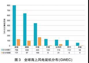 從全球分布來看,歐洲和中國是海上風(fēng)電發(fā)展的主要市場(chǎng),合計(jì)裝機(jī)占比接近全球的98%。2018年歐洲風(fēng)電發(fā)展出現(xiàn)整體下滑,成為2011年以來風(fēng)電裝機(jī)增長(zhǎng)最少的一年,我國海上風(fēng)電新增裝機(jī)首次超過英國和德國,位居全球第一位,進(jìn)一步縮小了累計(jì)裝機(jī)差距。全球海上風(fēng)電新增裝機(jī)前三位分別是中國166萬千瓦占比38.2%、英國131萬千瓦占比30.2%和德國97萬千瓦占比22.4%;累計(jì)裝機(jī)前三位分別是英國796萬千瓦占比34.6%、德國638萬千瓦占比27.7%和中國445萬千瓦占比19.3%(見圖3)。