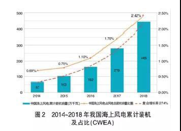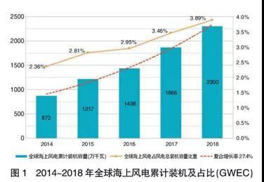 近五年來全球海上風(fēng)電發(fā)展迅速,復(fù)合增長(zhǎng)率達(dá)到27.4%,占風(fēng)電裝機(jī)總量比重不斷攀升,由2.36%上升至3.89%。我國海上風(fēng)電發(fā)展速度全球領(lǐng)先,復(fù)合增長(zhǎng)率達(dá)到60.5%,近兩年更是達(dá)到72.2%(2017年)和59.5%(2018年),占風(fēng)電裝機(jī)總量比重由0.69%上升至2.42%。