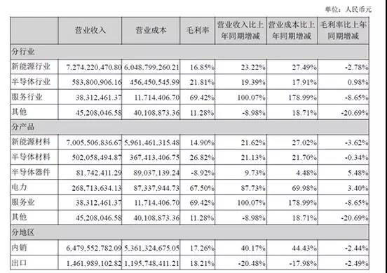 2019年上半年,新能源材料錄得營收70.06億元,占營收比重88.21%,同比增加21.62%,帶動中環(huán)股份整體營收同比大漲22.91%;電力錄得營收2.69億元,同比大幅增長87.73%。
