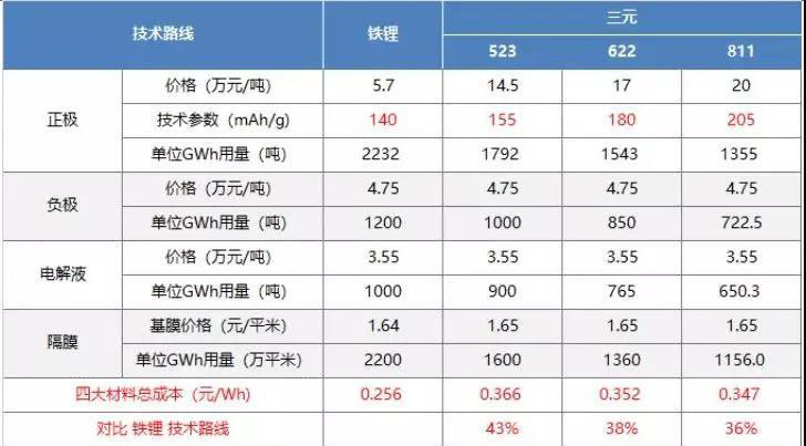 第二:隨著三元電池技術(shù)路線升級(jí),從523升級(jí)到622,再從622升級(jí)到811,單位Wh動(dòng)力電池使用的負(fù)極、隔膜和電解液用量都相應(yīng)減少15%。目前鐵鋰的四大材料總成本是0.26元/Wh,而三元的四大材料成本比鐵鋰的至少高35%。磷酸鐵鋰技術(shù)路線相對(duì)于三元技術(shù)路線有明顯的成本優(yōu)勢(shì)。