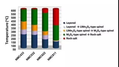 從材料的結(jié)構(gòu)來看,磷酸鐵鋰正極材料為橄欖石結(jié)構(gòu),其結(jié)構(gòu)中的磷酸基、Fe-P-O鍵遠(yuǎn)強(qiáng)于層狀結(jié)構(gòu)NCM中的Ni-O、Co-O和Mn-O鍵,因此磷酸鐵鋰有更好的熱穩(wěn)定性。一般磷酸鐵鋰材料熱分解溫度約為250~270℃,三元材料的熱分解溫度約為220~240℃。并且三元材料中隨著鎳含量增加,NCM523、NCM622和NCM811從層狀相到尖晶石相的相轉(zhuǎn)變溫度快速降低(235℃、185℃和135℃),尖晶石相存在的溫度區(qū)間也在逐步縮減,熱穩(wěn)定性逐步降低。