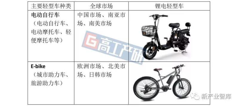 鋰電輕型車從類型上來(lái)劃分,主要有電動(dòng)自行車、電動(dòng)摩托車、輕便摩托車、E-bike,除去南亞和中國(guó)市場(chǎng)以電動(dòng)自行車、電動(dòng)摩托車、輕便摩托車為主要類型外,歐洲市場(chǎng)、北美市場(chǎng)以及日韓市場(chǎng)均以E-bike助力車為主要的鋰電輕型車。