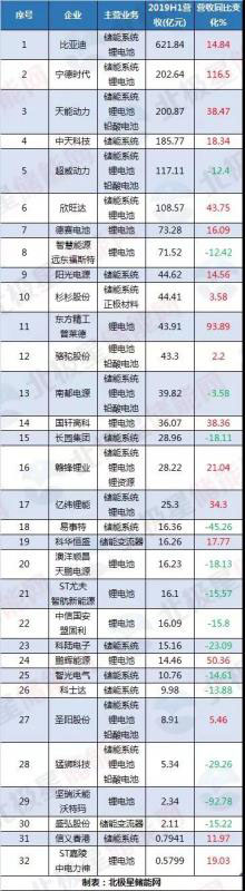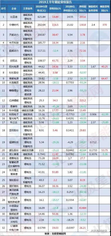 從營業(yè)收入來看,32家企業(yè)中過半企業(yè)業(yè)績飄紅、18家營業(yè)收入呈現(xiàn)增長。其中有直接參與儲能系統(tǒng)業(yè)務(wù)的21家企業(yè)中,有12家營業(yè)收入同比都有增長。按營業(yè)收入排名來看,第一梯隊有比亞迪、寧德時代、天能動力、中天科技、超威動力、欣旺達(dá)6家企業(yè)營業(yè)收入超過百億元。而且這6家企業(yè)中有5家都是以電池業(yè)務(wù)為主。超威動力和智慧能源(遠(yuǎn)東福斯特)在營業(yè)收入排名靠前,但與去年同期相比出現(xiàn)了下滑。此外鵬輝能源雖營收不多排名靠后,但與上年同期相比上漲超50%。