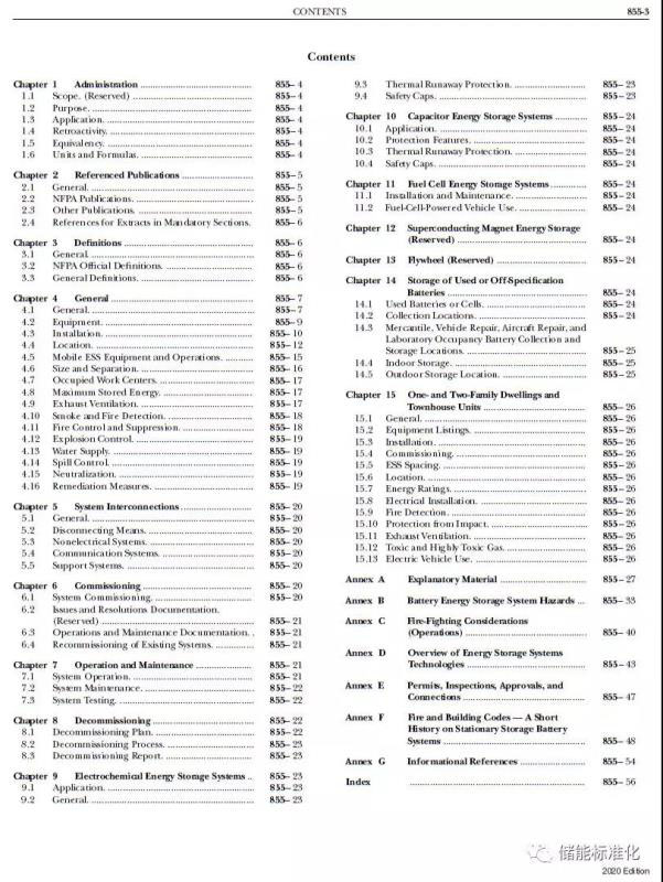 NFPA 855根據(jù)電力儲(chǔ)能系統(tǒng)采用的技術(shù),明確了儲(chǔ)能系統(tǒng)安裝、尺寸、隔離以及滅火和控制系統(tǒng)的要求。