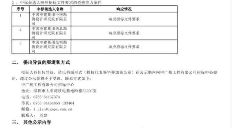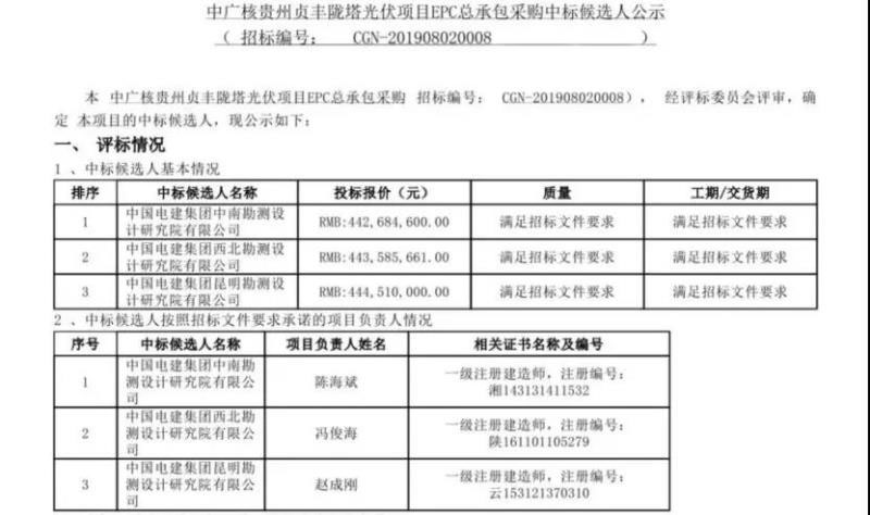 9月11日,中廣核貴州貞豐隴塔100MW光伏項目公示EPC總承包采購中標(biāo)候選人。中國電建集團中南勘測設(shè)計研究院有限公司以單價4.427元瓦位列第一中標(biāo)候選人,詳情如下: