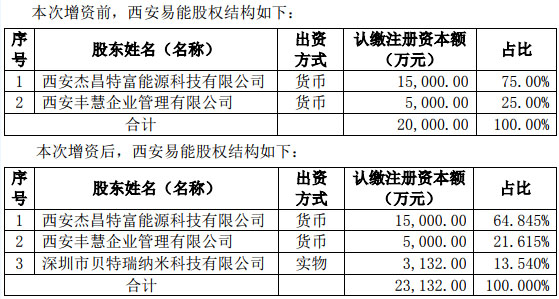 9月12日,貝特瑞發(fā)布公告稱,為了布局儲能市場,子公司深圳市貝特瑞納米科技有限公司擬利用110MWH電池資產(chǎn)作價8800萬元(含稅)投資入股西安易能智慧科技有限公司,投后持股占比 13.54%,同時將向西安易能派駐一名董事。由于公司持股比例較低,西安易能的日常經(jīng)營管理不由本公司主導。本次增資前后,西安易能股權(quán)結(jié)構(gòu)如下: